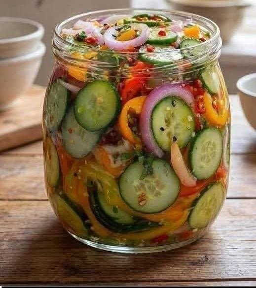 Here’s a vibrant, anti-inflammatory pickled cucumber, onion, and bell pepper salad — crisp, tangy, and full of flavor 🌶️🥒🧅