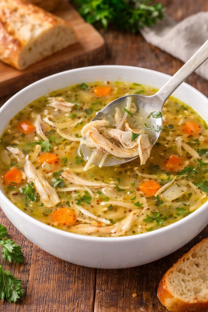 While the soup simmers, shred the cooked chicken into bite-sized pieces. -