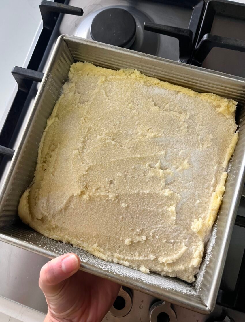Press 2/3 of the dough into the prepared pan evenly. Reserve the rest for the topping.