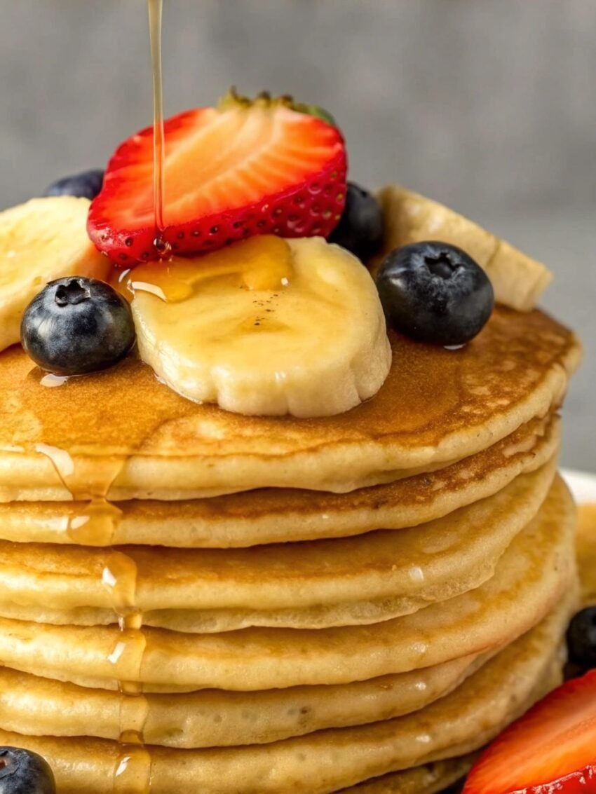 Stack pancakes, drizzle with maple syrup, honey, or yogurt.