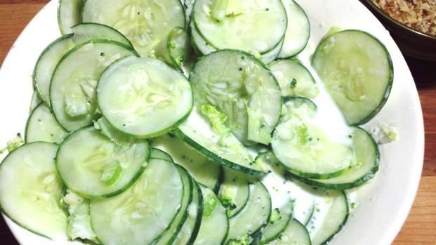 - Place sliced cucumbers in a colander and sprinkle with salt.