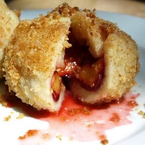 Take a small piece of dough (~2 tbsp), flatten it in your hand, place a plum in the center, and wrap the dough around it. Seal well so the plum is completely enclosed.