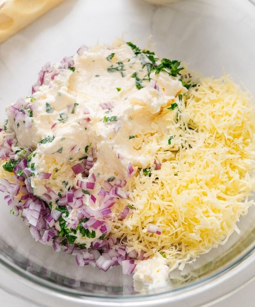 In a medium saucepan over low heat, combine shredded Jarlsberg, cream cheese, sour cream, mayonnaise, mustard, and garlic.