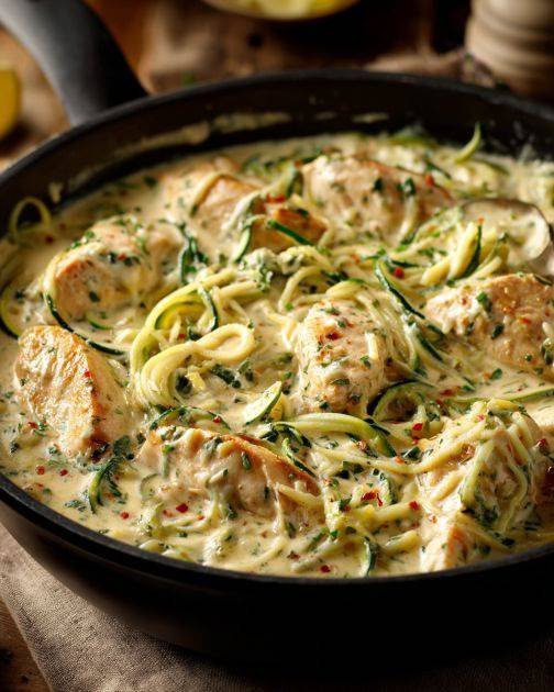A rich, creamy, and comforting low-carb meal that swaps pasta for Zucchini noodles, perfect for keeping carbs in check without sacrificing flavor.