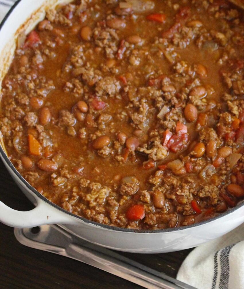 Reduce the heat and let the chili simmer for 1½–2 hours, uncovered or partially covered, so the flavors can deepen and the liquid reduces slightly. -
