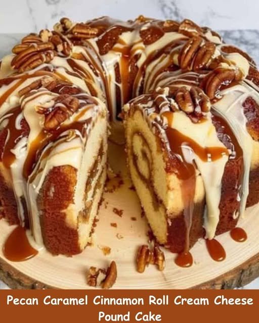 Oh yes — Pecan Caramel Cinnamon Roll Cream Cheese Pound Cake 🍰✨
