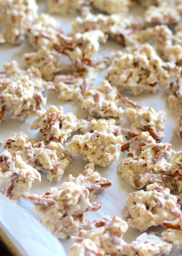 Drop spoonfuls of the mixture onto the parchment paper to form clusters.