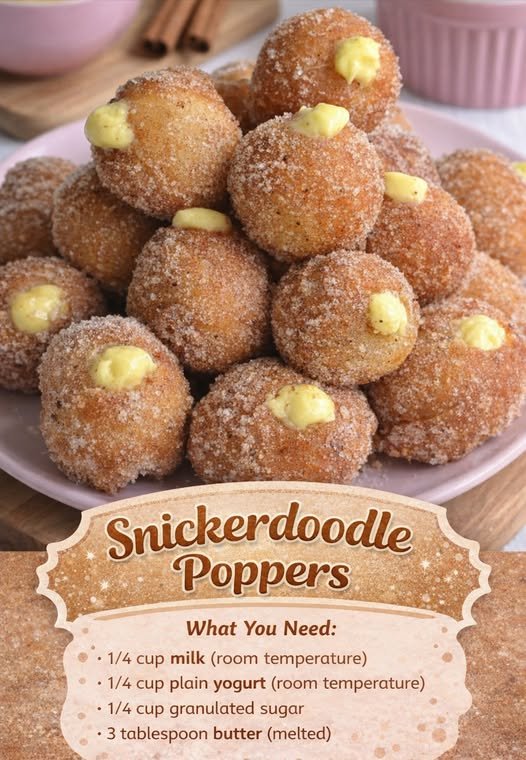 Oh yes 😍—Snickerdoodle Poppers are basically tiny bites of cinnamon-sugar heaven. Soft, chewy inside, lightly crisp outside, perfect for dipping in milk or coffee. Here’s how to make them: