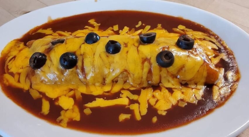Then it’s covered in red enchilada sauce, topped with melted cheese, and sometimes diced onions.