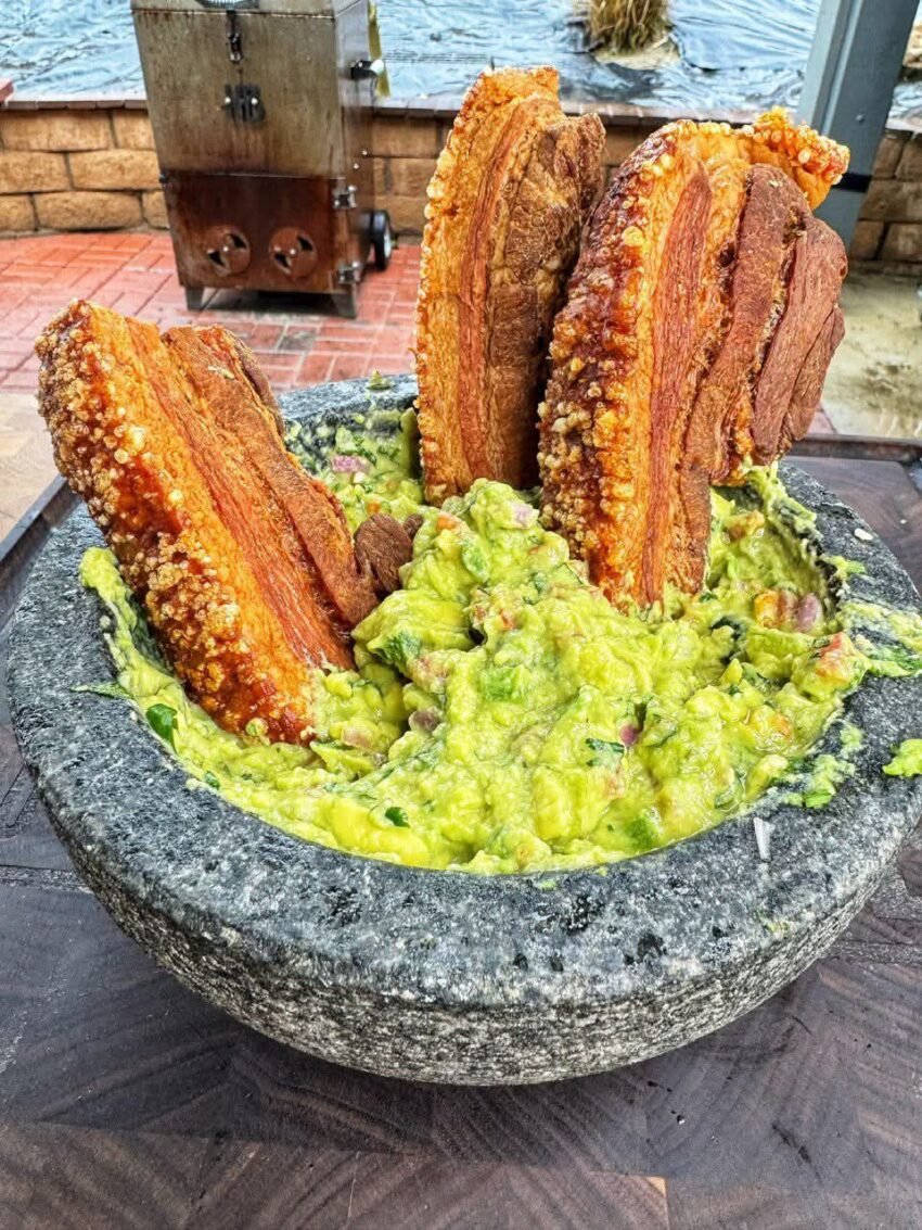 Oh yes — Guacamole with Chicharrónes 🥑🥓💥 — basically creamy, zesty guac with crunchy, salty pork cracklings for dipping. It’s indulgent, crunchy, and absolutely addictive.