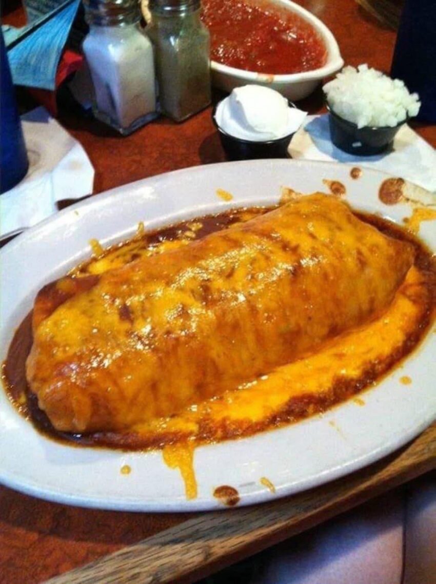 Cheesy wet burrito casserole: Layer several burritos in a dish and cover generously with sauce and cheese.